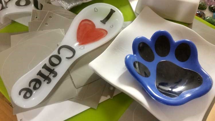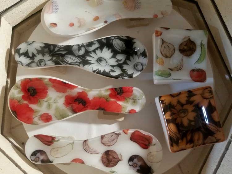 I’m playing with powders and stencils, crackle and scrap glass – all while my spoon rests and ‘tea bowls’ are coming together nicely. I’ve cut for another 12 spoon rests, and I’m working on some mid-sized bowls/plates … Next week I’ll restock our ornaments …