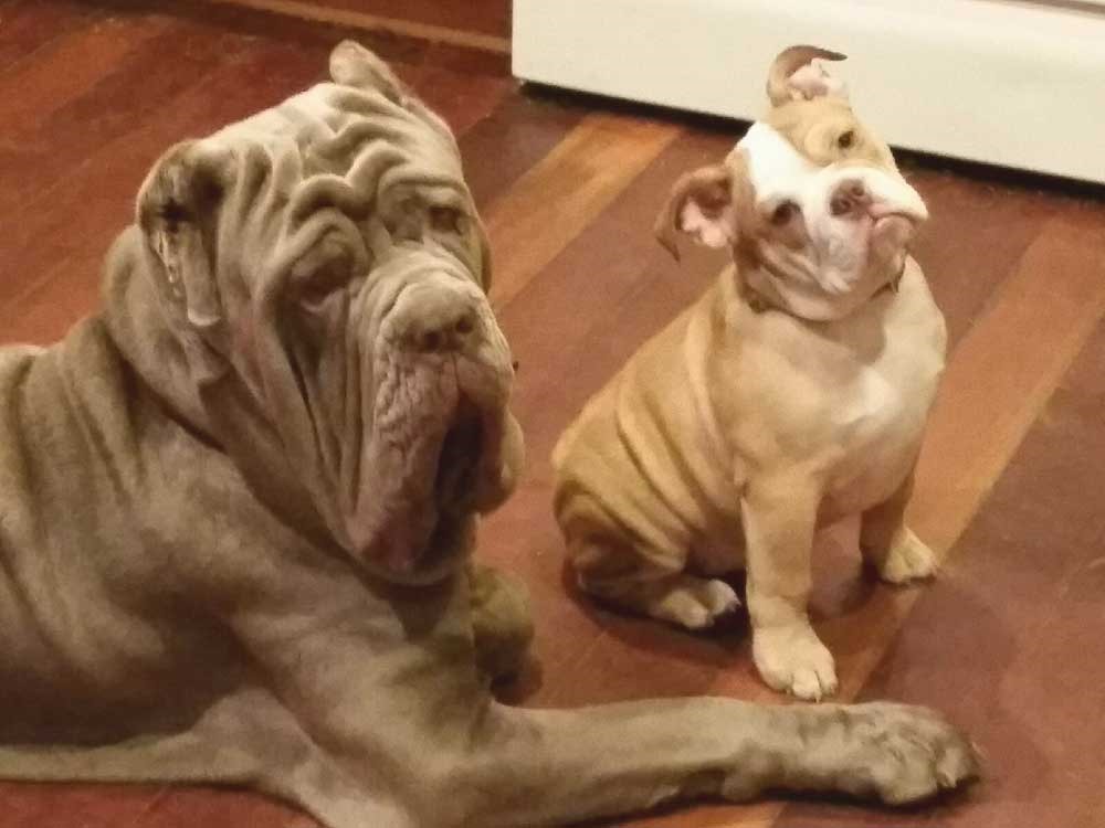 We had our yearly home vet visit today – so all my pooches are UTD on their shots. Poor CowBell has been sleeping most of the day. Here she is with Victor (her favorite wrestling buddy) …