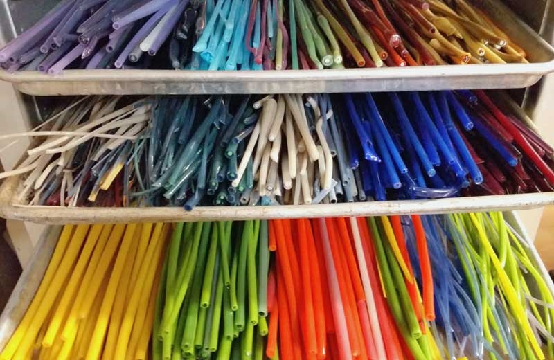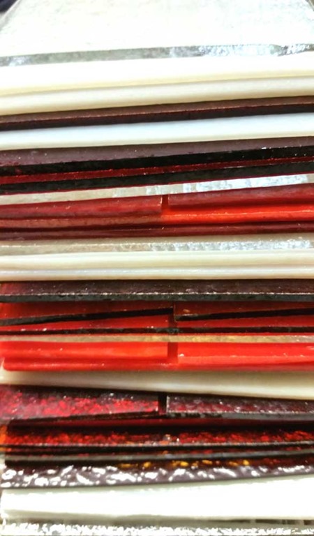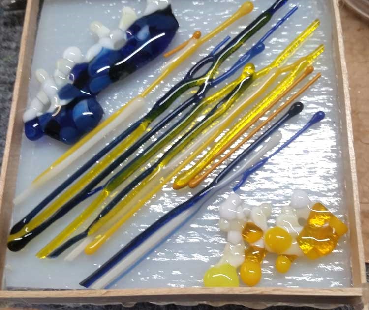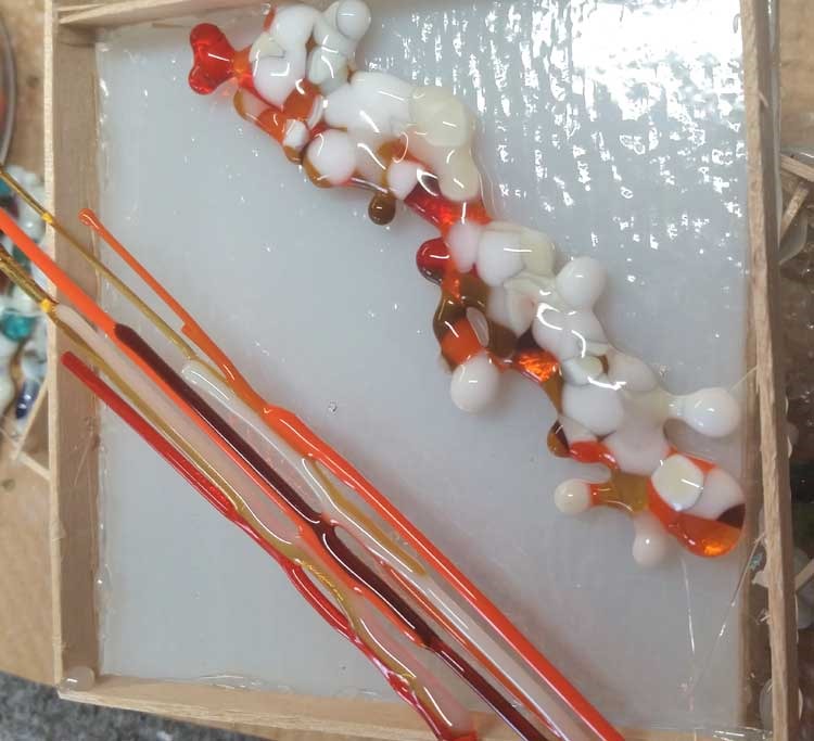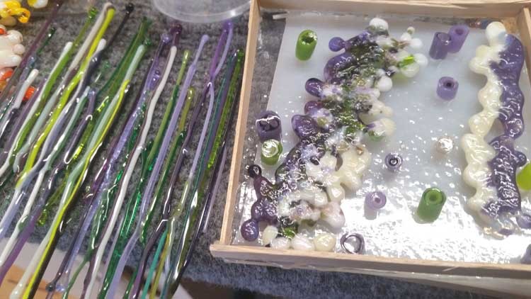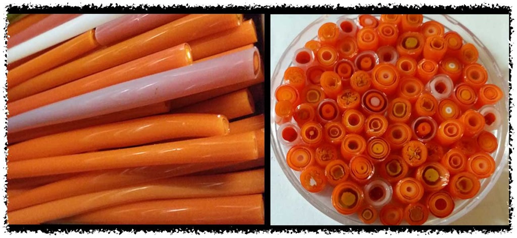 Now, back in the studio. We had another murrine/cane pull from the vitrigraph kiln … My goal is to create the 6 rainbow colors (which means I still need to pull a red pot), and then move into color-combinations … My cane collection is definitely growing!