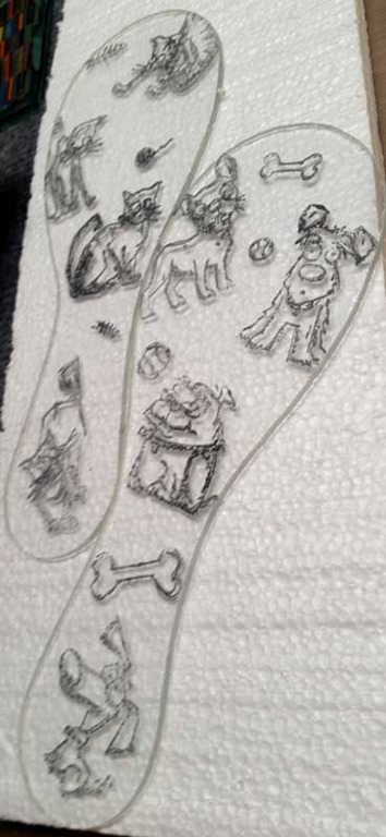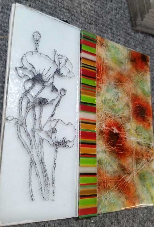 And then, I stole a few hours for enamel projects … I love the cat & dog spoon rests. We’ll see what the kiln makes out of the ring dishes (especially the Día de Muertos Mr. & Mrs. on the far right) … I also cut up one of my crackle poppy components, added a strip of coordinating tapestry glass, and stamped a poppy image for reverse enameling … Oh my! So many areas to go wrong. [Fingers crossed!] Time to get a kiln or two going!
