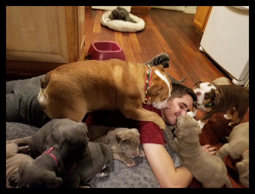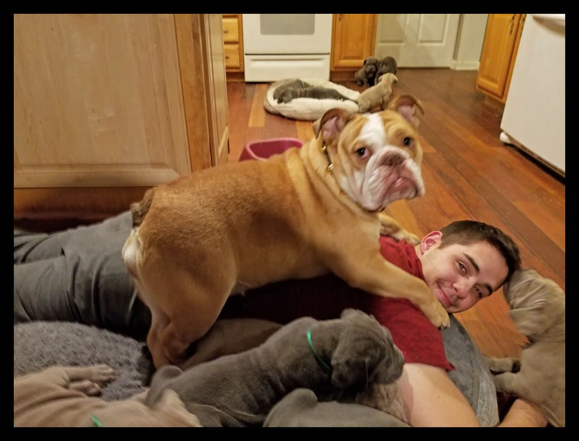 I know, play with cute puppies! Here’s our son – being DEVOURED by Neapolitan Mastiffs and English Bulldogs! Too cute!!!