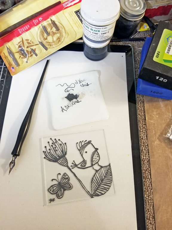 But first, special thanks to JP from Tattered Time and her Garden Stake Whimsy Tutorial. I love using a nib pen for drawing on glass! It is so much easier for me to control my lines (vs using a paint brush) – and her recipe for black enamel is well worth the tutorial price. I haven’t even played with her adorable patterns yet … But, here is my first nib drawing and tonight’s zentangle bulldog (reverse enamel):![]()