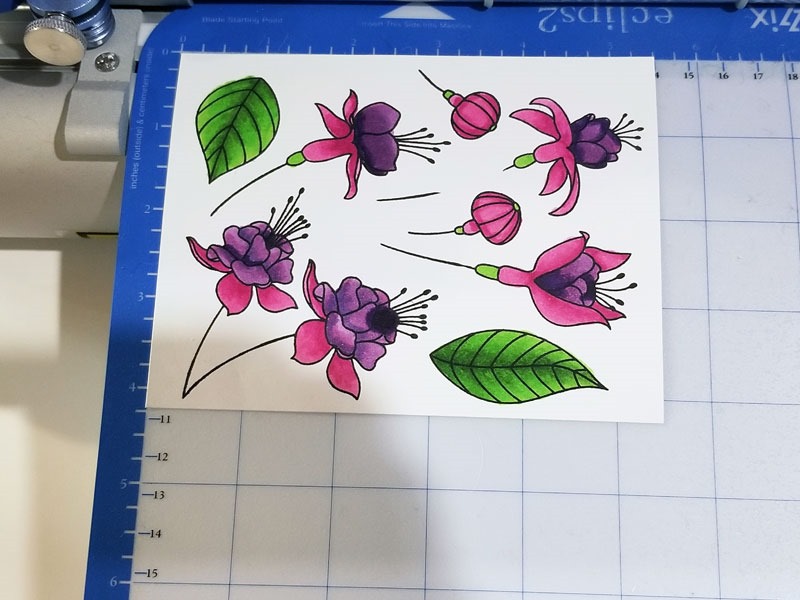 So, feeling unstoppable – I colored another set of fuchsias and decided to have a rematch with my Sizzix Eclips to die cut my designs. And that’s when the meltdown started. I butchered those beautiful flowers. I tried again with 3 more pages of stamped images. My eclips and I did come to an understanding regarding cutting blade depth and speed, but we could not reach mutual agreement, or compromise(!) with registration marks!!! So, we mutilated four sets of stamped fuchsias before I threw up the white flag and accepted defeat. [No pictures of the poor flowers, it’s just too painful!]