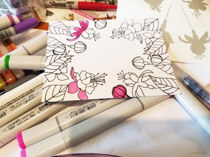 But first … I love me some fuchsias. I can’t write the word without the aid of spell check (what is up with that crazy spelling, anyway); I can’t keep the plant alive for long (much to my grandpa’s disappointment); but I LUV those flowers. And – turns out, I can stamp and color them!