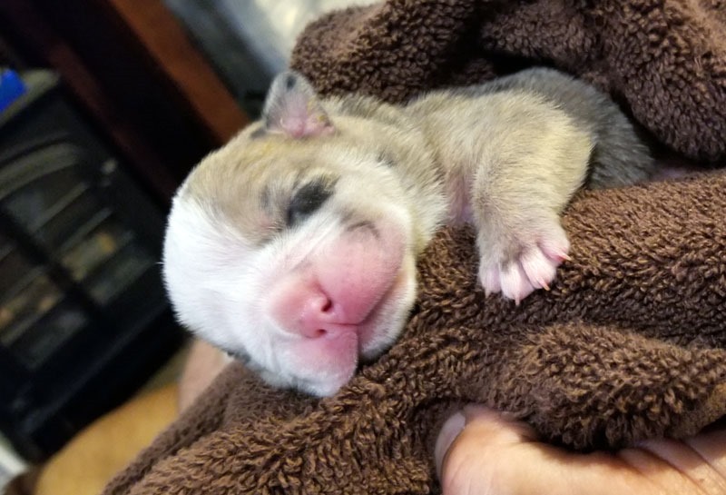 Life-on-the-outside is settling in (day 1 was a bit rough, as we had to learn and master ‘lay down’ before I would give her the babies). She loves her babies very much, and will grunt/whine (as only a bulldog can) when they are in the basket. Here’s lil miss Polka-Dot at 2 days old. (I love her merle markings and ‘mascara’ eyes!)