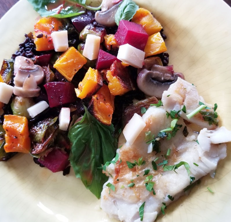We made our take on the Autumn Salad – with black rice, honey goat cheese, basil and drizzled with blood-orange vinaigrette dressing. I liked it. Not enough to make again, but … DH ate it, but he didn’t love it. Hmmm …. We paired it with pan fried Pollock, which was yummy.