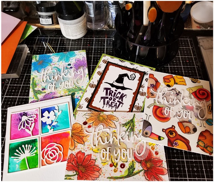 And, I finally pulled those card fronts together, into actual cards. The hold up – cutting, stacking and gluing four layers of (those white) die-cut sentiments and flower frames. Those are some tiny, fussy, fiddly bits. Once I remembered to put my cheater glasses on, so I could see everything – well, it went quite a bit faster …