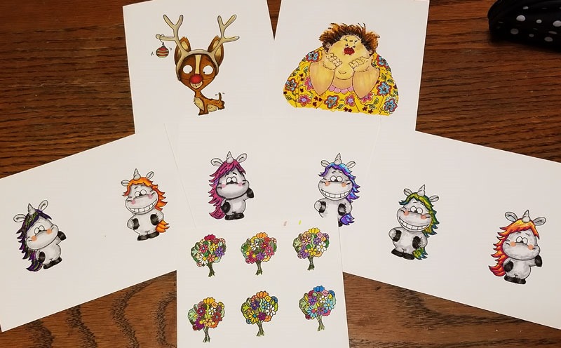 And when I need a break from knitting – I color. I’m working on some unicorn cards, and I couldn’t resist the reindeer and fat Wanda – ready for a kiss. I used my Zig Real Brush Markers … Because carting my Copics to the house would be a pain. The blending isn’t great, but … I still
