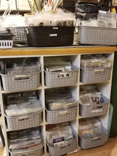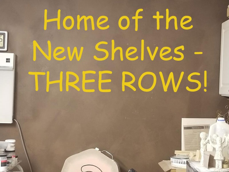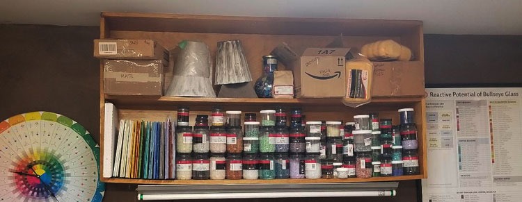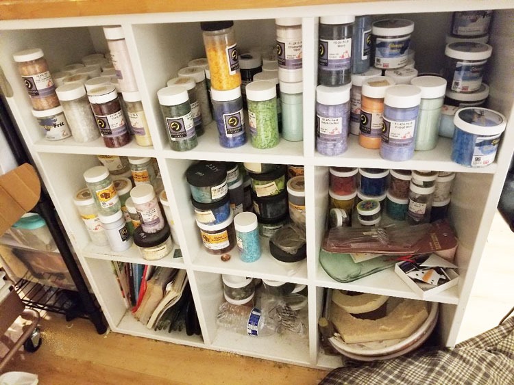 And, I’m cleaning and reorganizing the studio, with a little help from DH. I’ve run out of stamp storage, so I need to reclaim the other side of this work table. My coe96 coarse frit and confetti will move to a new shelving unit – once my carpenter finishes it, that is … Kind of like this one (coe90 shelves), but over here!