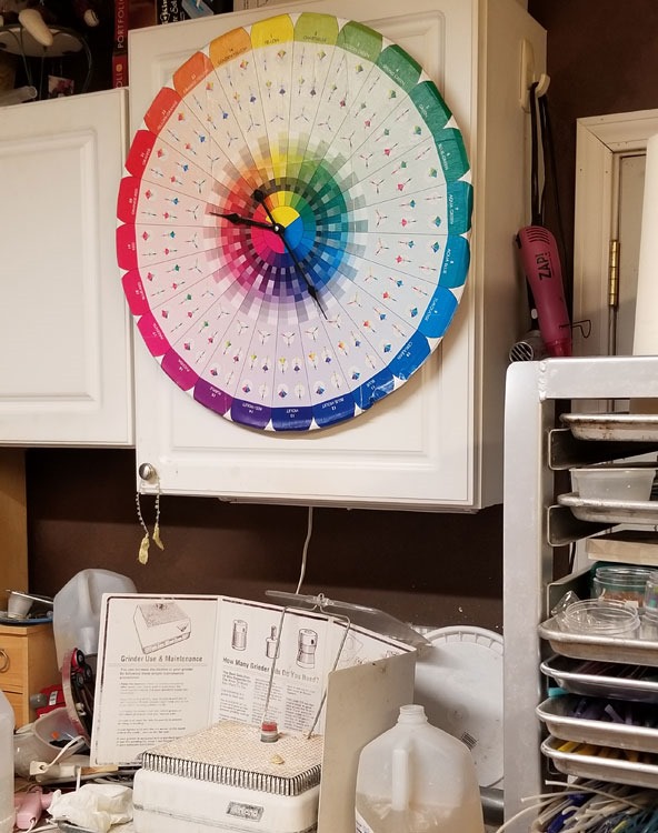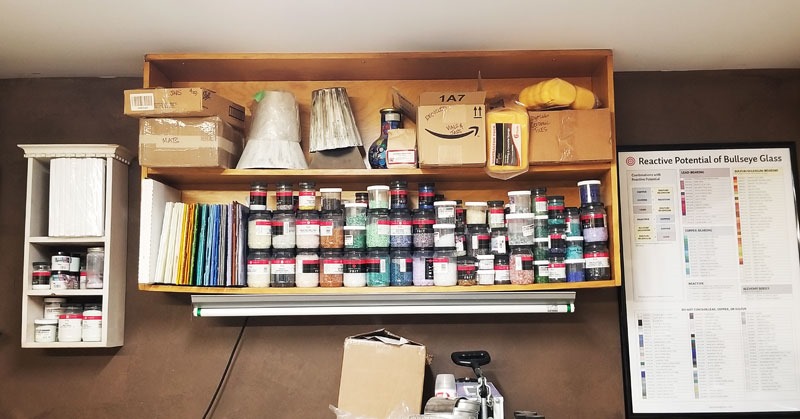 And back to baby steps: We got the new shelving unit up – and full. I like it. Sure, I’d like it bigger, BUT … I have my lesser-used (coe96 coarse and mosaic frit and confetti glass) tucked away, along with most of my ‘fancy’ cardstock; re-homed my cute (DH special) shelf over by the coe90 area, along with my color-wheel/clock; and then I filled up that cubicle storage with stamps. It works. It also means I have ZERO new storage space to discover. Which equates to this – ‘MUST MAKE MORE’ stuff, to use up the STUFF – before we endeavor on anymore HOBBIES .. DOH!!!