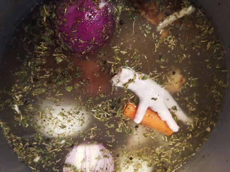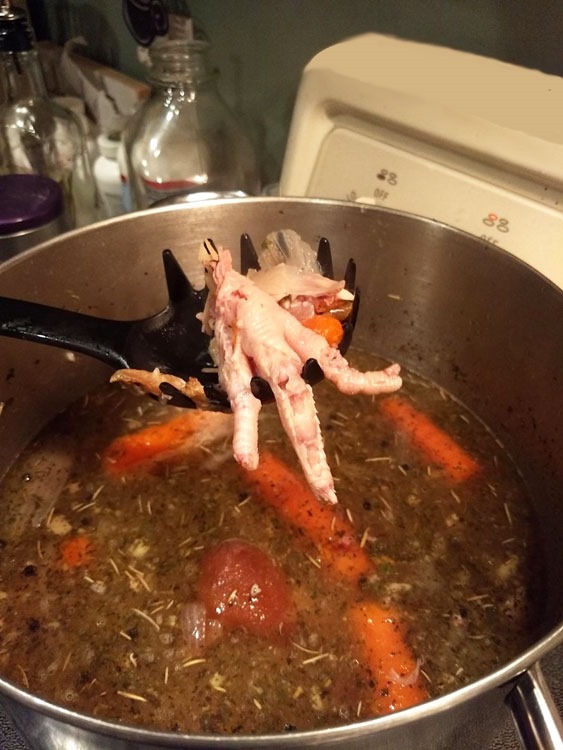 I made a vat of bone broth. I couldn’t help it. When I was at the grocery store, I stumbled on a package of chicken feet … CHICKEN FEET! And then I thought, ‘Well, why not?!?’ DH was a bit concerned – and kept taking pictures!