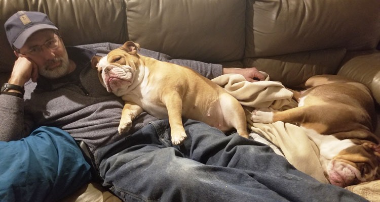 DH likes to hang out with the (bulldog) GIRLZ, while I work.
