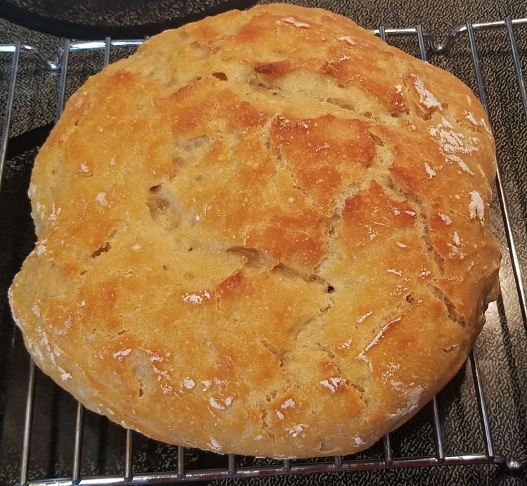 But, I regained his trust once we made our first loaf of ‘no knead bread’, and another batch of jam. (This time we used strawberries, mangoes and pears, oh my!) I have another ‘loaf’ of bread proofing, as I type. And, I think we need to try Honey Oat (no knead) bread next …