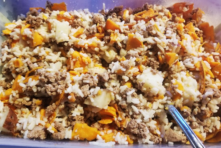 Not that she is a picky eater, but I wanted to mix up some goodies just for Ro (and Gina) … So, I steamed a sweet potato to add to turkey burger and rice. Oh yea – they love it!