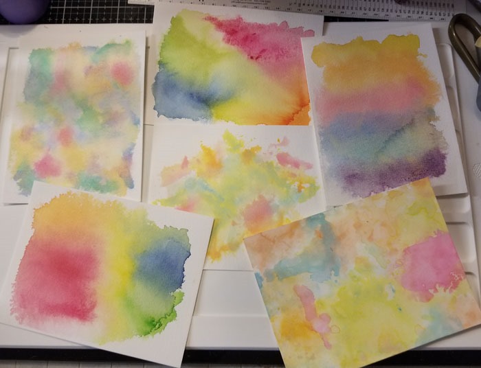 I had some dealings with difficult people this week – at work and at home.   Why do people choose to be rude and ugly?  Anyway, the mojo was off in the glass studio.  So, I played with cards.  I made some watercolor backgrounds.