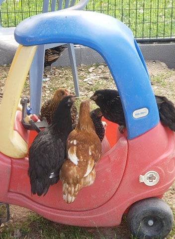 Speaking of The Ladies – they’re growing and are so fun to watch. Even Chloe likes to keep a close eye on them. Oh – they love their clown car! ![]()