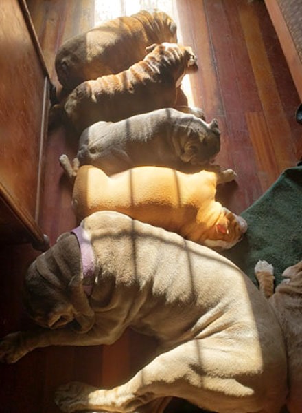 That pretty much gets us up to date. I need to squeeze in a few hours of mandatory nursing competencies, and will find some pool time before heading back to work this weekend. So for now, I’ll leave with a photo of Victor and the Bulldog crew catching a sunshine nap … Awww!
