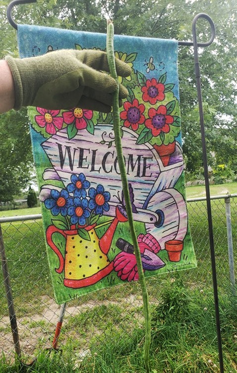 We harvested our first asparagus bean … check out that bean! They are really starting to climb the cow panel trellis!