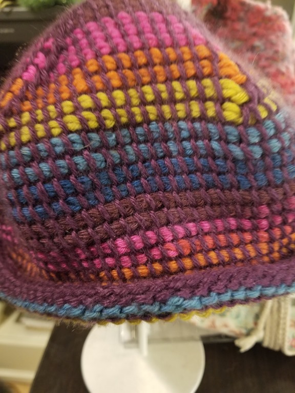 Meanwhile, I am crocheting the ‘fast hats’ … here is another ‘Rainbow Plum’ to add to our growing display. I feel like we have a ‘Baby’ hat, now a ‘Mama’ hat … So I am working on a ‘Daddy’ hat … We will see if it fits DH’s head – and if he likes it …