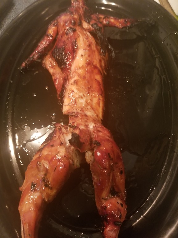 Here is the promised Hasenpfeffer photo (No – it does NOT look like an INFANT! DH, stop saying that!), with our garden-grown new potatoes, what’s left from some of our chamomile tea (love it), bread machine zucchini bread (NOPE! We won’t be making it that way again!) …And tonight’s herbal harvest: