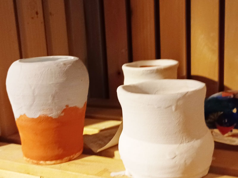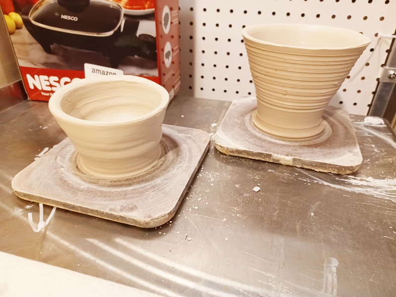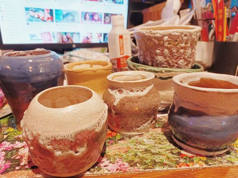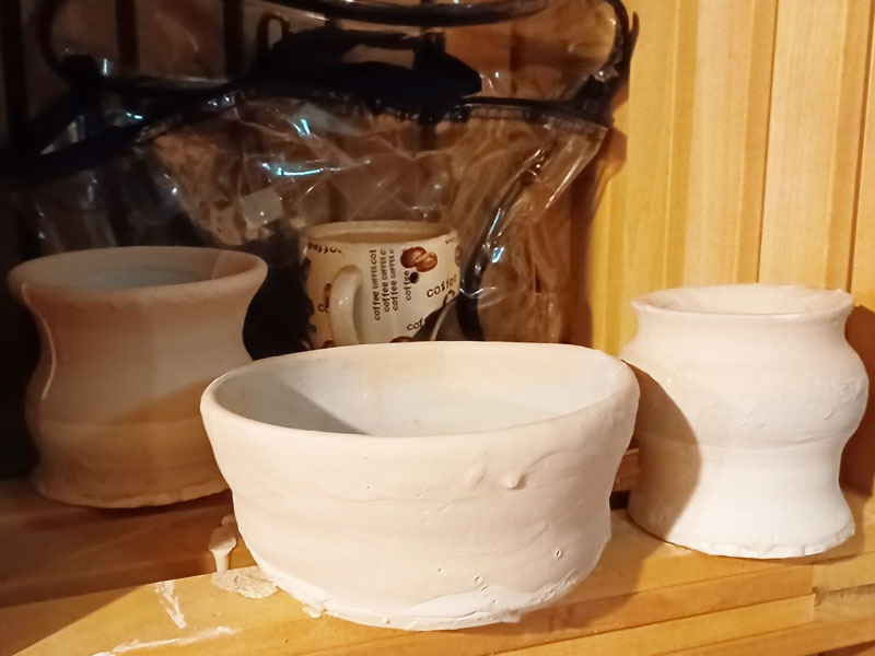 We are throwing ‘pots’ – gaining knowledge to control clay on the potter’s wheel daily. Again, DH has more innate skill, and patience – than I do. But, I have better glaze-dunking abilities (… so yeah, he’s still ‘beating’ me …) … ![]()