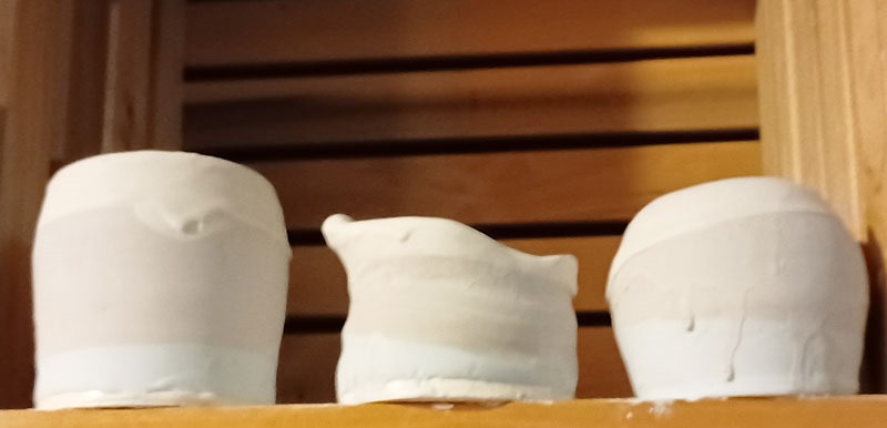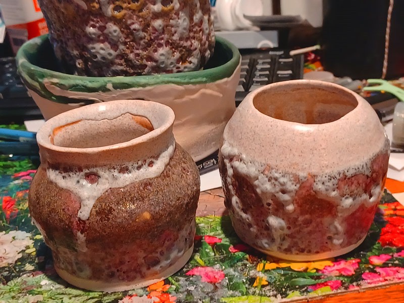 We worked our way through a kiln issue and finally fired our first (and second – in the kiln as I type) batch of ceramic pots. Live and learn is the message of the week! And we are learning … But, check out that Walking Dead/Zombie Lung interior we created … Dang!!!