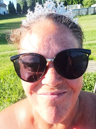 I knew I needed a tetanus shot, so OBVIOUSLY the best way to get that is to swan dive out of one’s pool to perform a [9.3 … 9.1 …9.6 … 9.2 … 9.4 – the judges have scored …] FACE-PLANT onto a cement paver outside of said pool. Yep, that tetanus shot was mine, ALL MINE! [Yes, that was a wee few hours after my last post … here is a photo of happy me, in my anniversary tiara, just minutes before …]