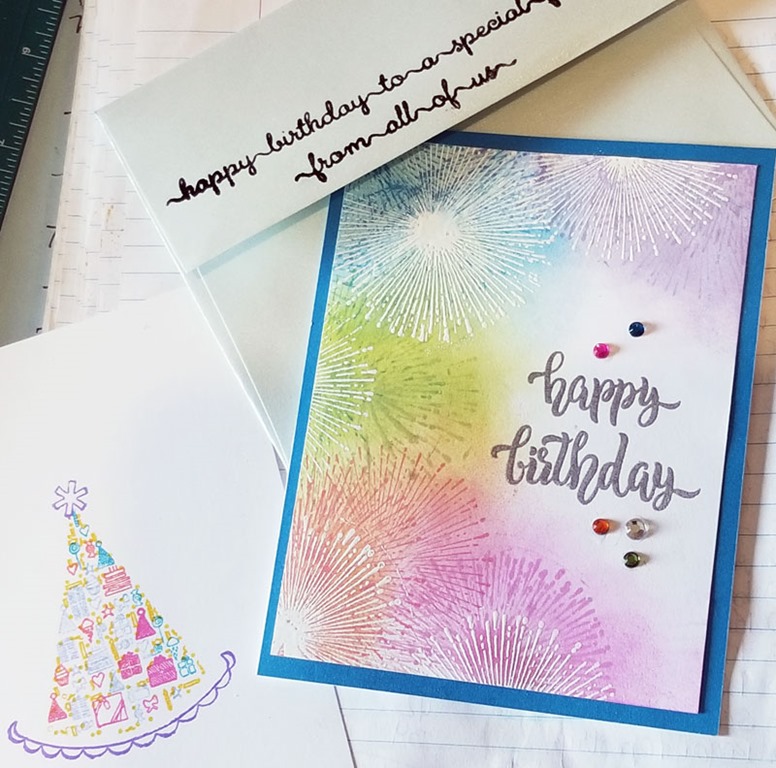 I spit out a few more cute CAS cards. And then got busy – ummm, too busy with the background, colors and embossing on the dogs birthday card … Meh – it’s a man’s card. I like the birthday hyena though …