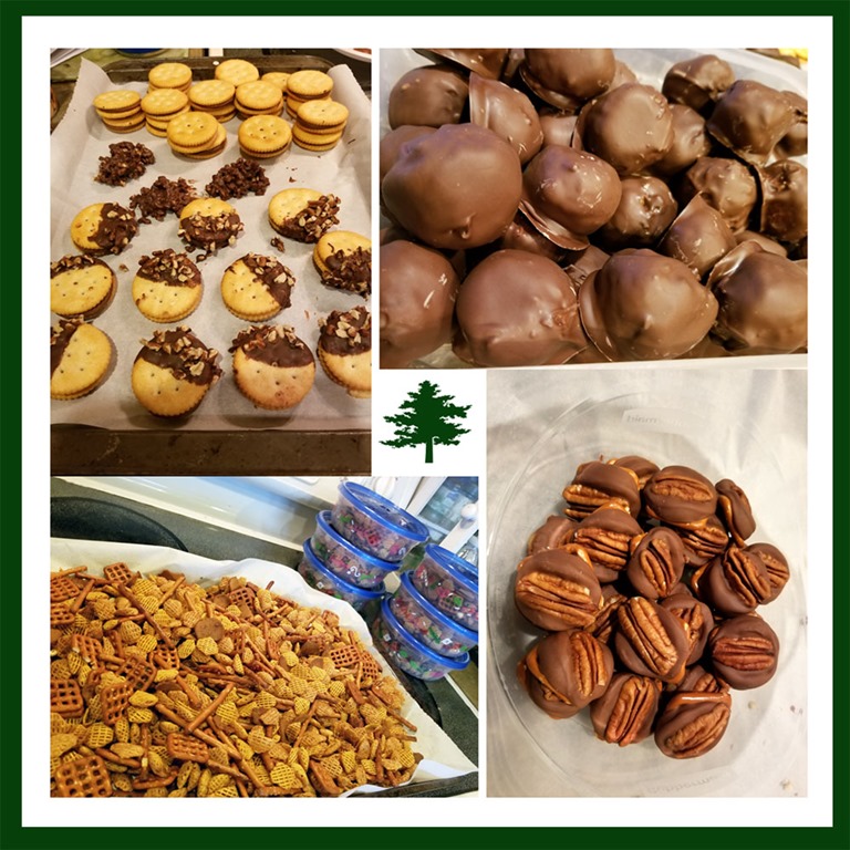 On Friday, we did our ‘Christmas kitchen’: Chex Mix, Turtles, Peanut Butter Balls, Rollo Cracker Cookies, and (not pictured) Teryaki Pork Jerky. AND, (I know, RIGHT?!?) we finished wrapping presents … All set for Monday morning – when I get home from WORK for a magical Christmas! [I’ll take the traditional present/tree photo then.]