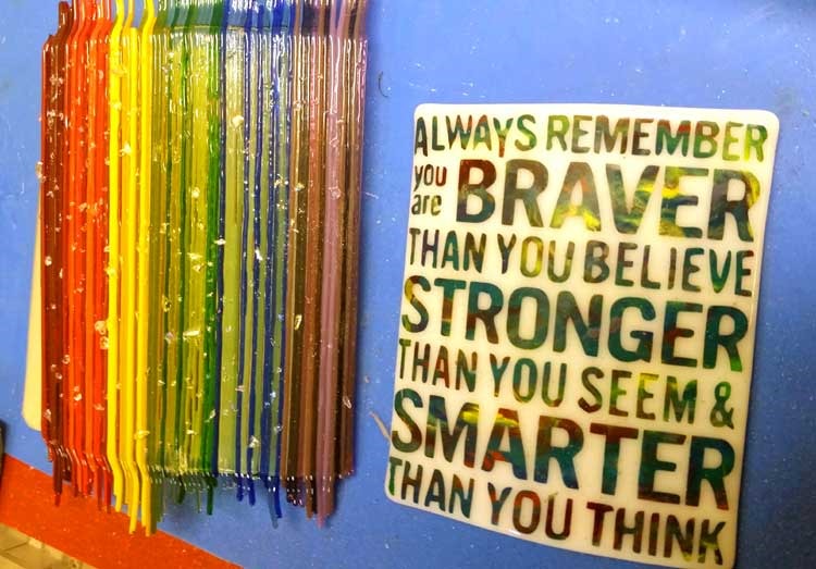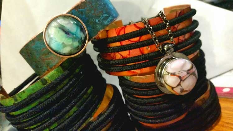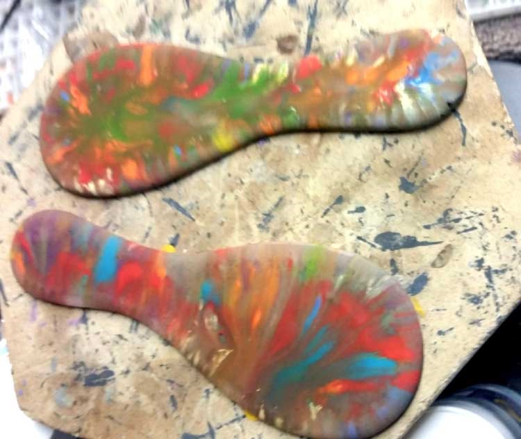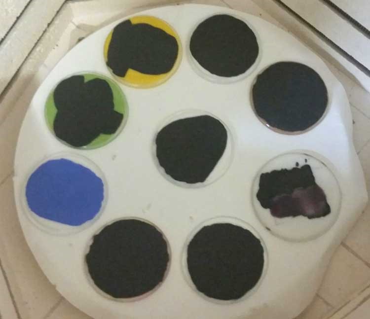 Moving on … I’m in a cab craze. The mica cabs didn’t work out, and in retrospect, at the high temps I take the cabs through … they wouldn’t. [Duh!] But, the enamel with crushed glass, hot glass and frit … There’s definitely some playing to do there! So – here are the photos: Cabs from my last post, close-ups; Cabs pre-fire and post, back in the kiln for another round right now; Today’s cabs waiting for their turn in the kiln: