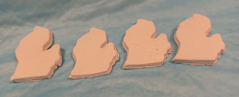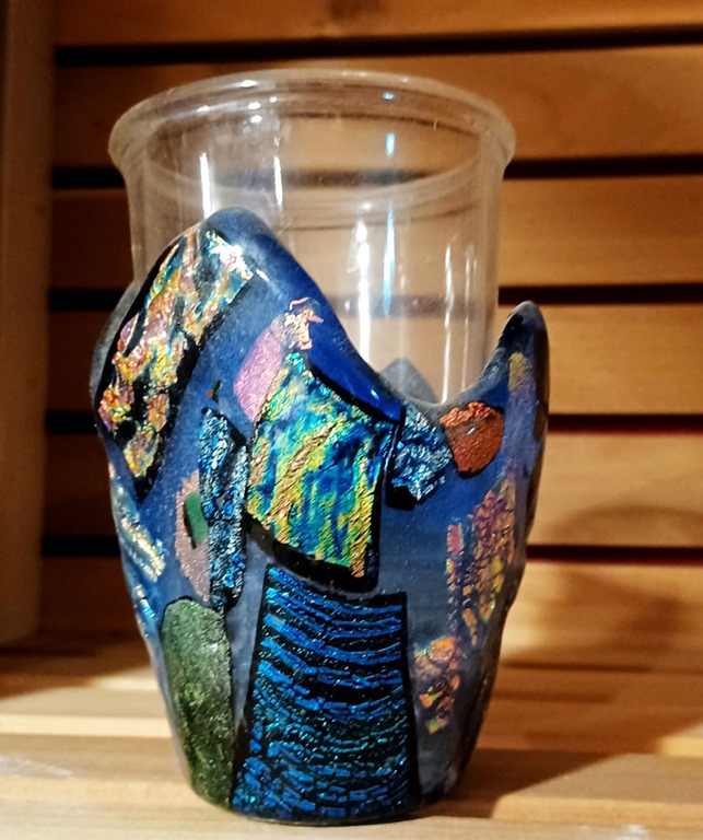A fused glass cup holder/pencil-cup I uncovered from when the kilns were in the house. I’m playing with clay shapes to add to our coffee mugs, using silicone molds and cookie cutters that we have. And lastly, our most recent glazing ready for the kiln (trial 2). Baby steps!!!