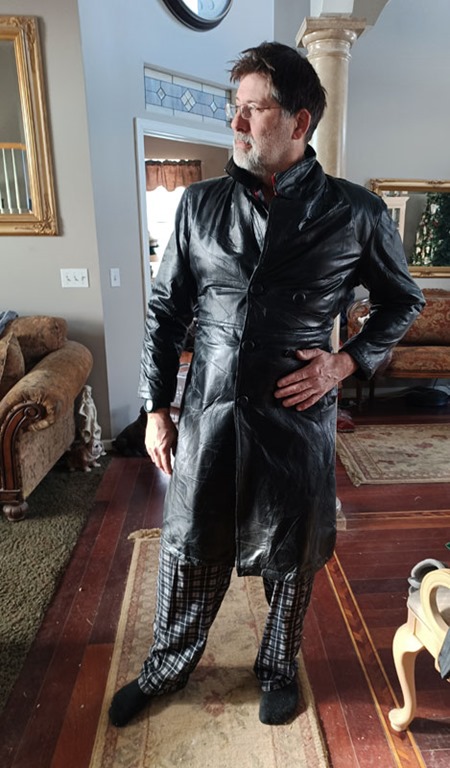 I mentioned deep cleaning … well, one of those jobs was cleaning out our closets, where DH stumbled on this crazy leather jacket (seriously hideous) and felt compelled to model it, so I took a few photos. I’d say he’s (NOT QUITE) ready for the runway/modeling career! ![]()