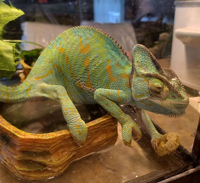 And our gift from the twins … Meet Roz the chameleon! She is presently staying with the twins as we have a bit too much going on right now with all of our other animals. But she’s cute – in her lizardly way …