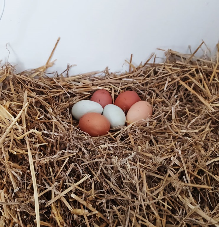 Our Ladies (the chickens) are NOT laying in their nesting boxes, which makes me think a couple of things … 1) Too cold or 2) They are BRATS! But, either way, we store the extra straw (for the outdoor run) in their coop. Here is where they are laying eggs now. Even Miss Hannigan started to lay again (green eggs), so I’ll take it. In the meantime, we have wrapped the outer portion of their run with wind barriers, making it very nice and toasty (or at least breeze-free). Happy Ladies, happy eggs, happy Chicken-Mom! ![]()