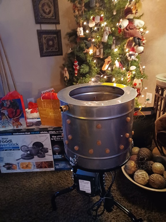 Our Christmas morning: The chicken feather plucker is mine and DH received a 10 piece set of pots and pans that he had wanted for some time.
