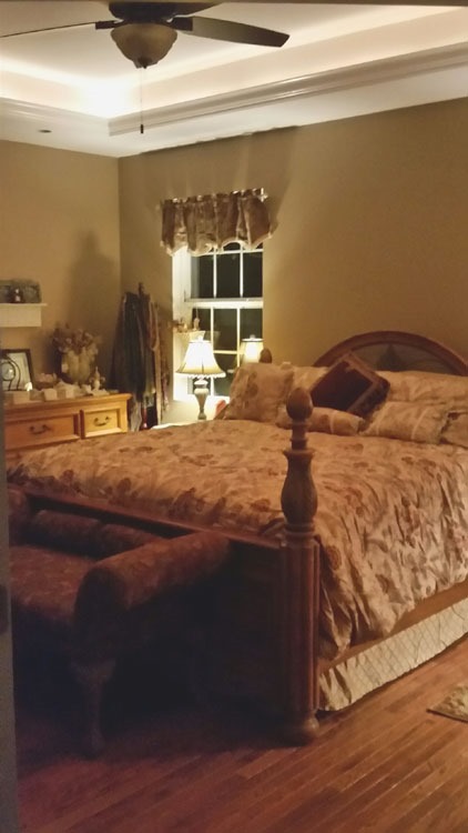 All of this means DH totally didn’t think through the timing of (cosmetically) gutting our bedroom. He installed new crown moulding with fancy mood lighting – (OH, pretty! …) and now we’re on HOLD. So, things like the mattress and headboard and boxes and … STUFF – are sitting in my open entry/living/dining rooms – complete with Christmas trees … for the next several weeks! Nope, Martha never had a holiday gathering with these fine decorations – Just Sayin’ … [No photo of entry yet, but here is the master bedroom ~ with fancy lighting, missing furniture, and no new flooring …]
