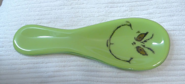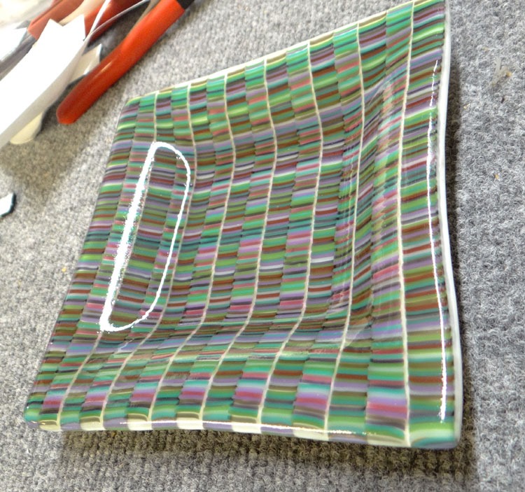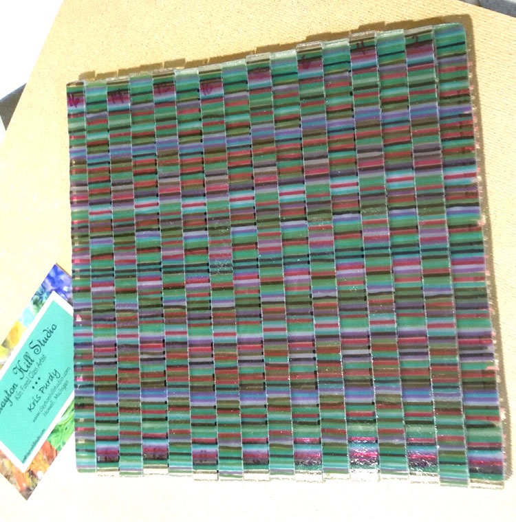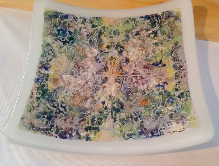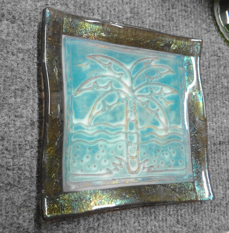 I learned a new technique on Sunday, so – I had to drop everything to give it a try. I painted enamel on glass separator (thinfire), embossed it, stuck it on a piece of painted clear glass (capped with clear) and fired that bugger. It definitely has some possibilities. (Pre-fire and fired.)
