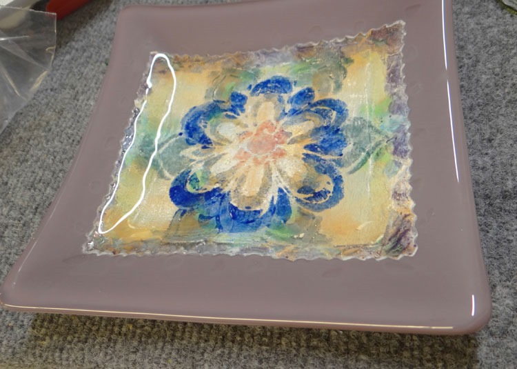 And, lastly – we capped a punched out painted fleur-de-lis between clear and colored glass … I still have this large piece of painted thinfire to play with – but want to ruminate on some ideas first. Oh, and get ready for our show in T-12 days …