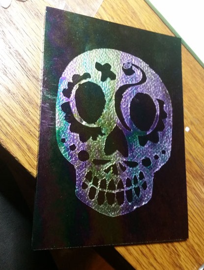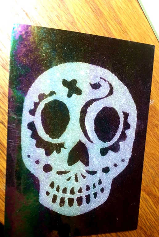 BTW – here is my sugar skull experiment. It worked (sort of …), but I’d like to see a thicker frit layer. And, the fact that I had to hand-cut the stencil defeats the purpose of my trial. Hmm …