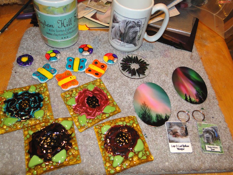 Meanwhile – studio news: I’ve spent some more time playing with the dye-sub than the glass – but I’m having fun, so that’s what’s important … I live in mega-big t-shirts through the week, so I had some fun using my cheater-method dye-sub, making more interesting shirts for me to wear; marble coaster tile sets (Yorkies and Coffee themed), a dragonfly coaster and an ornament of Sophia. I’m still learning, as sometimes the image presses clearly, other times not so much … trying to pick apart what I did differently, what I’m missing …