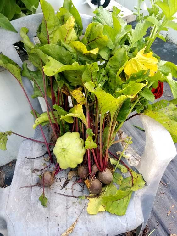 My garden is winding down …. We do have a handful of beautiful sunflowers (standing amazingly proud and tall) in their 5 gallon buckets, as DH wouldn’t let me cut any holes in the black mat he so painstakingly installed this spring … We also have the sweet potatoes, some beets, winter squash and the last of the pole beans to collect. And DH and I shivered through our final dip in the pool on Wednesday, before we closed it up for the winter … [Heavy sigh!]