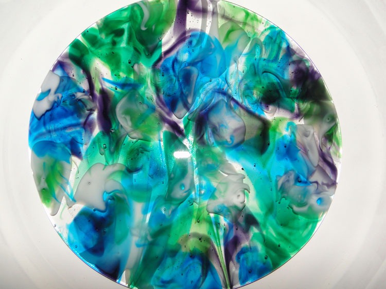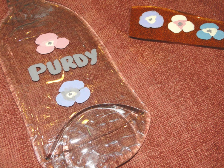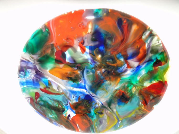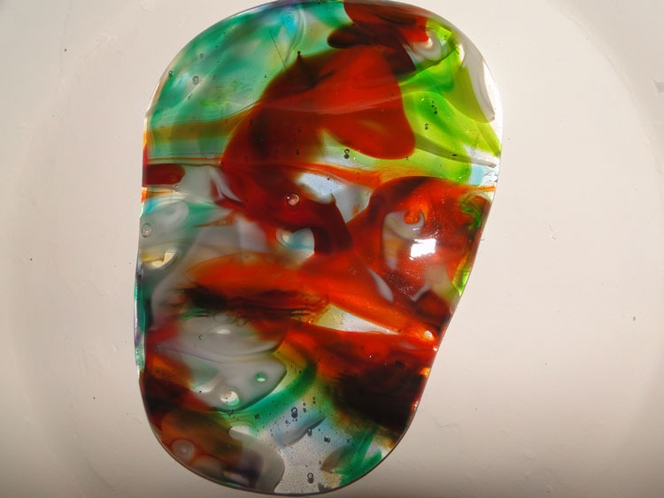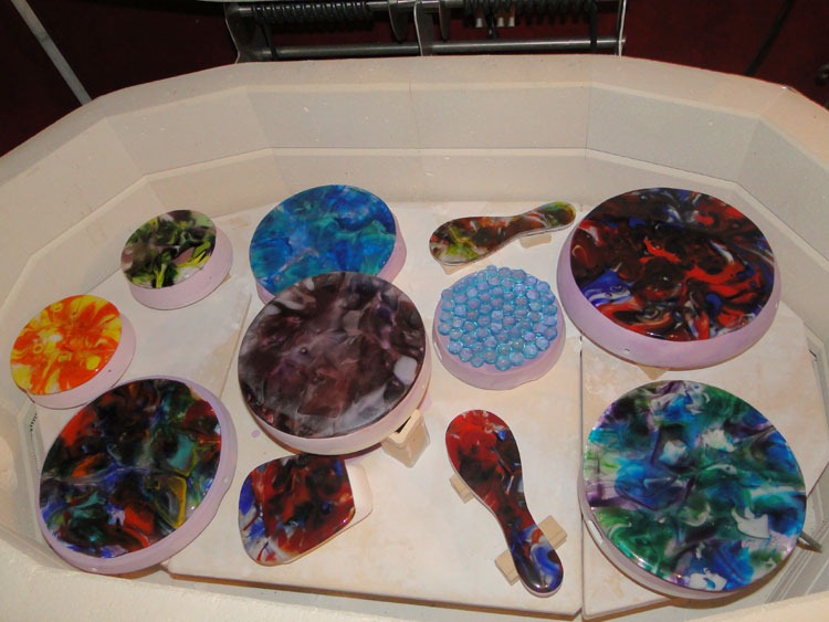 Meanwhile, in the studio … my coffin has been busy. Had my slump-run: Some nice things, some things that have potential and some things that will be re-worked. Photo of projects I like below. The coffin is cooling down from a bottle slump now – as I purchased a new wine bottle bowl mold and flat mold I was eager to try (photos to come later …). Once the coffin cools, I’ll be reloading it to do a flattening/de-bubble run.